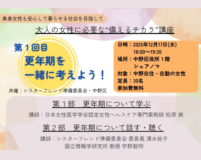 大人の女性に必要な“備えるチカラ”講座 ~更年期を一緒に考えよう~(東京都中野区)